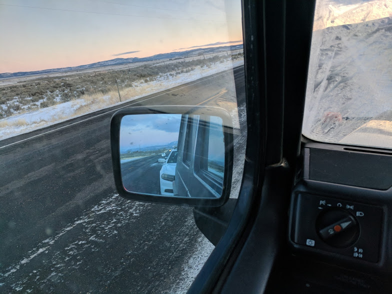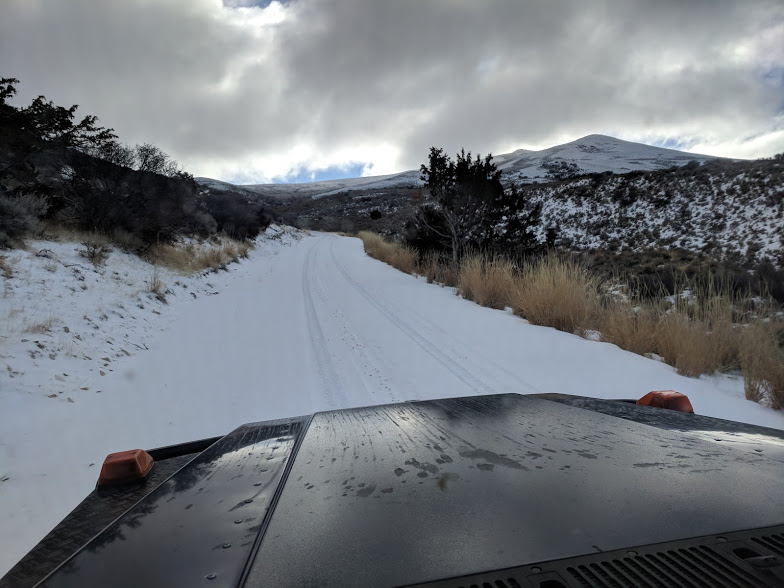 Took the I-84 out through Oregon into Idaho and picked out a spot at City of Rocks. We were the only campers there so it was nice. Snowing and blowing all night, but the temps never dipped below 22 deg F. Beautiful location, we are definitely going back come summer time. The road out was a county road that dropped into Utah with up to 2" snow on it and occasional ranch truck tracks to boost our confidence in the route