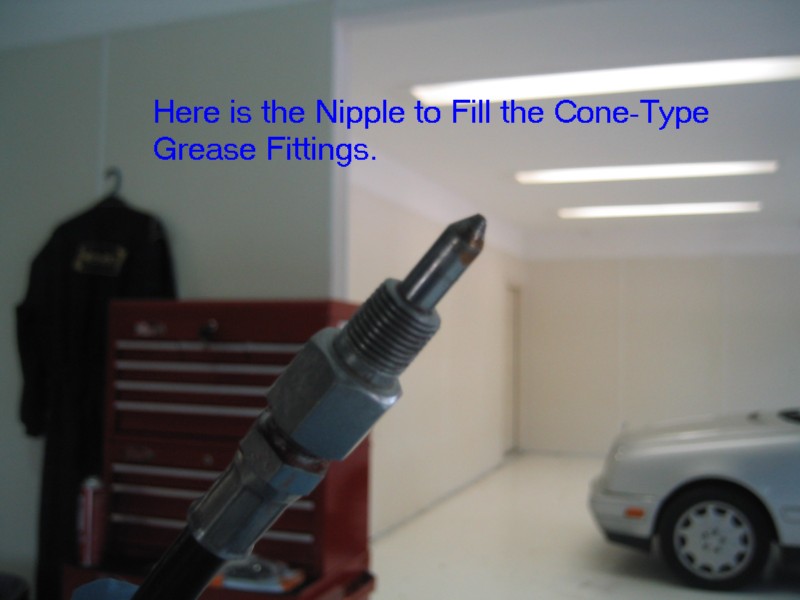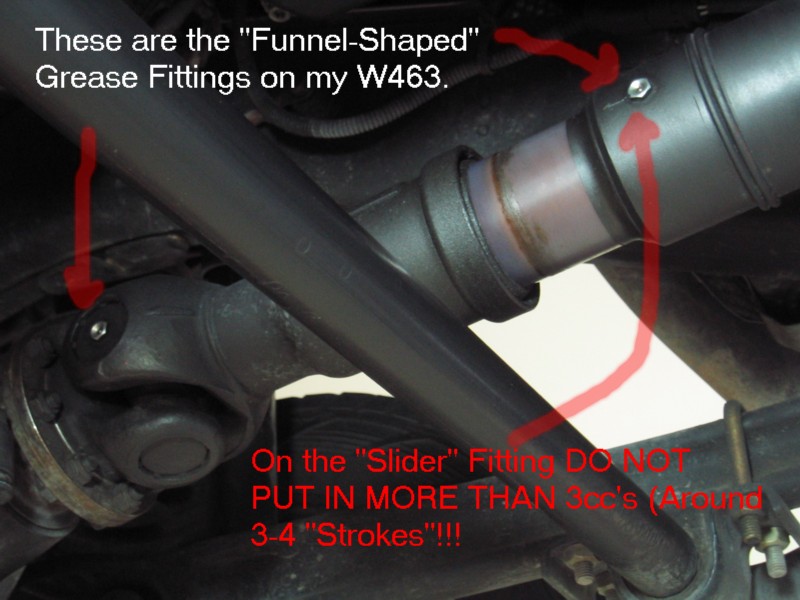 | G-AMG G-Class DIY Host Date registered: May 2006 Location: South Texas Vehicle(s): '04 G55, '80 280GE, '99 S420, '98 E320, 2011 E350 ![]() | Photo DIY- Propeller Shaft Lube Yes, another stupidly easy posting. I Lube After EVERY Oil Change. Yes, overkill perhaps. But with what I have heard for the replacement costs of these puppies..... Better Safe than Sorry!! Be sure to THOROUGHLY clean the nipples before lubing. LATE ENTRY: The "Cone Adapter" for the Cone-Type fittings is available as follows (thanks to tj4tj4 for supplying the info): For the record, the needle point adapter required for lubrication is NAPA part number 715-1215. It costs about $5, call ahead and make sure they have it before you make the trip, I'm not sure demand is very high. (1.JPG) (2.JPG) (3.JPG) (4.JPG) (5.JPG) (6.JPG) (7.JPG) (8.JPG) Attachments ---------------- 1.JPG (92KB - 157 downloads) 2.JPG (56KB - 158 downloads) 3.JPG (106KB - 159 downloads) 4.JPG (94KB - 170 downloads) 5.JPG (94KB - 156 downloads) 6.JPG (82KB - 156 downloads) 7.JPG (53KB - 169 downloads) 8.JPG (110KB - 172 downloads) | ||
