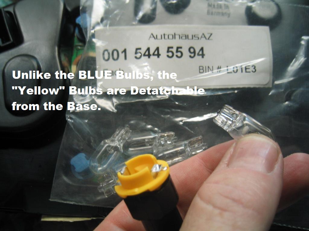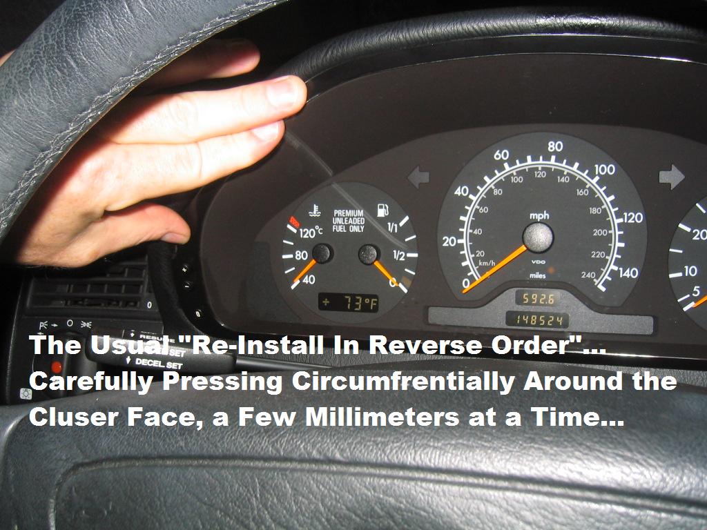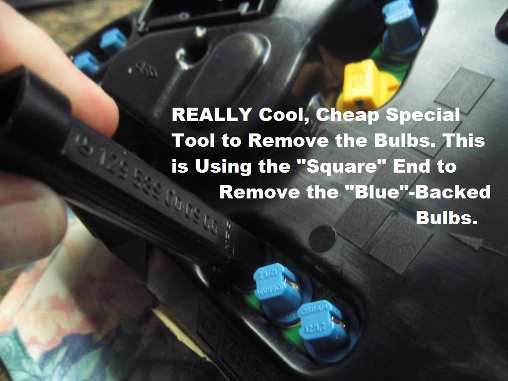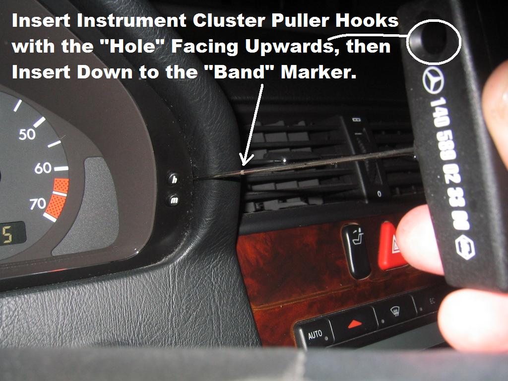 | G-AMG G-Class DIY Host Date registered: May 2006 Location: South Texas Vehicle(s): '04 G55, '80 280GE, '99 S420, '98 E320, 2011 E350 ![]() | Photo DIY- Instrument Cluster Bulb R/R As part of a "Full Body Cavity" Repair-Visit to my Mother-in-Law's... Burned-Out Instrument Cluster Bulbs was on the List. Please note: This is for a 1996 C220 (W202.022), so the Type/Number of bulbs will Vary. I purchased the Bulbs from AutoHausAZ, at a FRACTION of the cost as the dealer... and they were the OEM Osram Bulbs... Be EXCEEDINGLY CAREFUL Removing the Cluster, as there are many reports of Folks "Breaking" the Cluster Lens or Plastic Surround. They are very VERY Expensive to replace. If you pull the Cluster out only a few Millimeters at a time... and Alternate between Left & Right, you should have no problems.... I have taken out many of these, with *NO* broken lenses! The M-B tool shown is only a couple of bucks, but will make the job really REALLY easy to do! G (1.jpg) (2.jpg) (3.jpg) (4.jpg) (5.jpg) (6.jpg) (7.jpg) (8.jpg) (9.jpg) (10.jpg) (11.jpg) (12.jpg) (13.jpg) (14.jpg) (15.jpg) Attachments ---------------- 1.jpg (137KB - 250 downloads) 2.jpg (118KB - 240 downloads) 3.jpg (108KB - 238 downloads) 4.jpg (122KB - 237 downloads) 5.jpg (122KB - 243 downloads) 6.jpg (94KB - 246 downloads) 7.jpg (118KB - 227 downloads) 8.jpg (106KB - 240 downloads) 9.jpg (94KB - 247 downloads) 10.jpg (81KB - 236 downloads) 11.jpg (83KB - 252 downloads) 12.jpg (90KB - 240 downloads) 13.jpg (100KB - 249 downloads) 14.jpg (89KB - 240 downloads) 15.jpg (132KB - 237 downloads) | ||