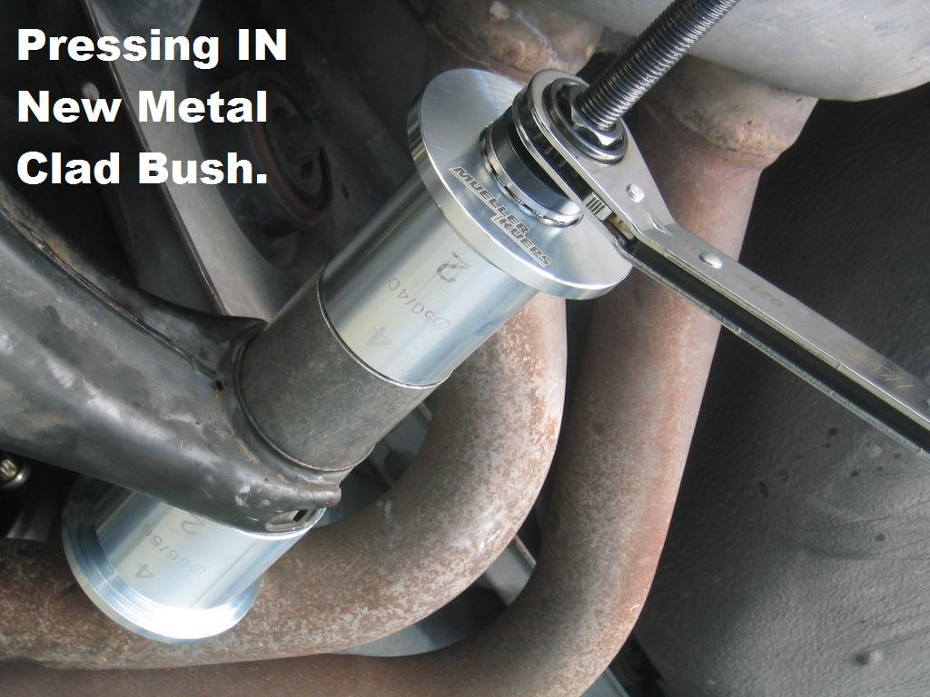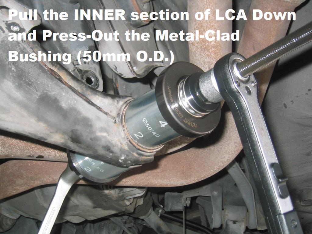 | G-AMG G-Class DIY Host Date registered: May 2006 Location: South Texas Vehicle(s): '04 G55, '80 280GE, '99 S420, '98 E320, 2011 E350 ![]() | Photo DIY- Rear LCA "Inner" Bushing R/R *ON VEHICLE* Per my previous posts, I have done MOST of the Rear-End Suspension. Therefore, I opted to just Finish the Rear-end, and call it a day. The "INNER" Metal-Clad Bushing of the Lower Control Arm is VERY Tightly Afixed, so you will require a good-quality Press/Pulling Set-Up, whether it be Home-Brewed, or Commercially available. I am not going to go into the particulars of the actual set-up I used, as it is a Mixture of different sets. Please Note!!! The Factory Procedure specifies, Complete REMOVAL of the LCA, and R/R the Metal Clad Bush using a Hydraulic Press. For that procedure, please refer to my next post, which shows the "OFF VEHICLE" rendition of the bush R/R. Since this is NOT a Specified WIS procedure, it is being posted Solely for "Entertainment Value Only" and not as a procedure guide. G (1.jpg) (2.jpg) (3.jpg) (4.jpg) (5.jpg) (6.jpg) (7.jpg) (8.jpg) (9.jpg) (10.jpg) Attachments ---------------- 1.jpg (88KB - 228 downloads) 2.jpg (100KB - 213 downloads) 3.jpg (114KB - 212 downloads) 4.jpg (127KB - 210 downloads) 5.jpg (93KB - 217 downloads) 6.jpg (107KB - 240 downloads) 7.jpg (72KB - 208 downloads) 8.jpg (133KB - 219 downloads) 9.jpg (104KB - 225 downloads) 10.jpg (138KB - 204 downloads) | ||
