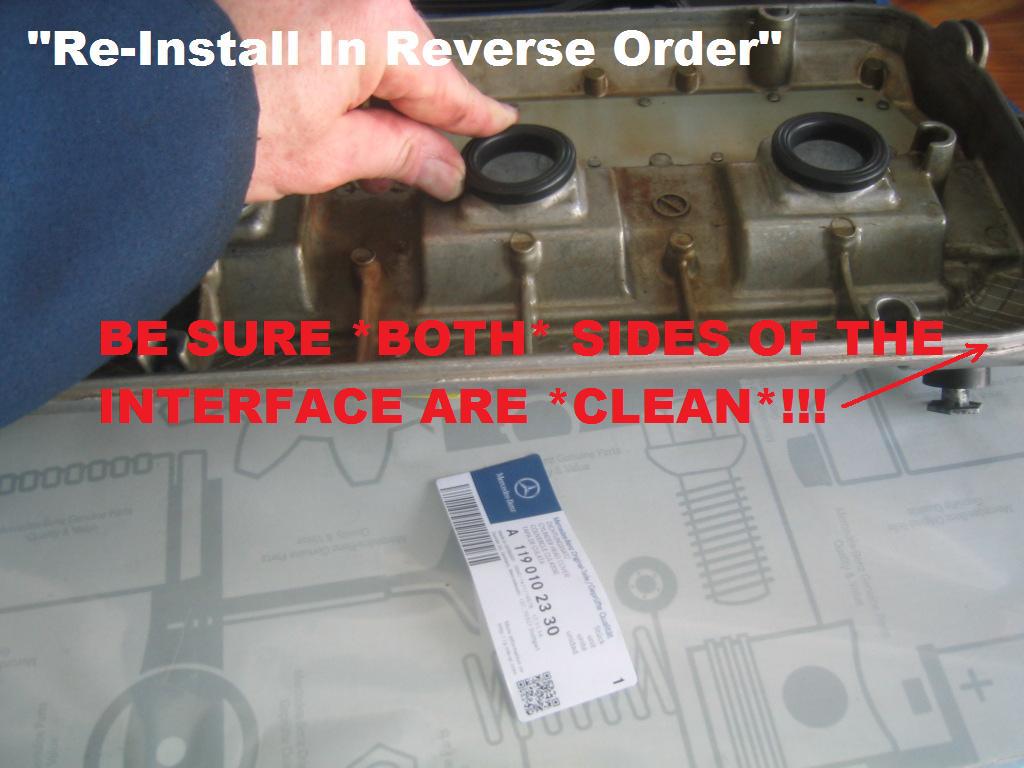 | G-AMG G-Class DIY Host Date registered: May 2006 Location: South Texas Vehicle(s): '04 G55, '80 280GE, '99 S420, '98 E320, 2011 E350 ![]() | Photo DIY- M119 Valve Cover Gasket R/R M119 on 1999 S420 Well, I thought I was in the clear... after Re-Sealing the Camshaft Adjuster Solenoids... Found a nice puddle on my nice white garage floors!! That won't do, at all!! ;^) Having a look from underneath, revealed a "common" leak, from the Aft, "U-Shaped" section of the Valve cover Gasket. Upon removal? The Gasket was as *HARD* as a Rock!! And Brittle!! IMPORTANT NOTE!!!-- When Ordering your valve cover Gaskets? Make sure you order the "Sealing Rings" for the Cover Bolts. Also, you will "Most-Likely" Need New Breather Hoses, as well. You would be Well-Advised to "Feel" the Rubbers prior to contemplating the Job, so you have them On-Hand. The Driver's Side (LHD Vehicles) is the more difficult of the two, as you need to remove several hoses, including the Fuel Lines. Obviously have rags to catch any Fuel Drips, and a Fire Extinguisher on-hand. Plug the Connections upon removal, to prevent contamination. The Passenger's Side? Much Easier. In fact, I was able to Tilt the Valve Cover sufficiently to R/R the Gasket, WITHOUT the need to Disconnect the Breather Hose, or the Wire Harness. Hope this Helps someone.. "G" (1.jpg) (2.jpg) (3.jpg) (4.jpg) (5.jpg) (6.jpg) (7.jpg) (8.jpg) (9.jpg) (10.jpg) (11.jpg) (12.jpg) (13.jpg) (14.jpg) (15.jpg) (16.jpg) (17.jpg) (18.jpg) (19.jpg) (20.jpg) (21.jpg) (22.jpg) (23.jpg) (24.jpg) (25.jpg) (26.jpg) (27.jpg) Attachments ---------------- 1.jpg (137KB - 242 downloads) 2.jpg (98KB - 213 downloads) 3.jpg (112KB - 216 downloads) 4.jpg (93KB - 229 downloads) 5.jpg (105KB - 222 downloads) 6.jpg (92KB - 233 downloads) 7.jpg (90KB - 237 downloads) 8.jpg (101KB - 223 downloads) 9.jpg (92KB - 227 downloads) 10.jpg (89KB - 212 downloads) 11.jpg (88KB - 217 downloads) 12.jpg (109KB - 212 downloads) 13.jpg (123KB - 203 downloads) 14.jpg (103KB - 236 downloads) 15.jpg (133KB - 213 downloads) 16.jpg (106KB - 214 downloads) 17.jpg (83KB - 221 downloads) 18.jpg (64KB - 213 downloads) 19.jpg (79KB - 214 downloads) 20.jpg (90KB - 220 downloads) 21.jpg (69KB - 230 downloads) 22.jpg (126KB - 221 downloads) 23.jpg (79KB - 227 downloads) 24.jpg (93KB - 219 downloads) 25.jpg (115KB - 258 downloads) 26.jpg (117KB - 243 downloads) 27.jpg (103KB - 231 downloads) | ||