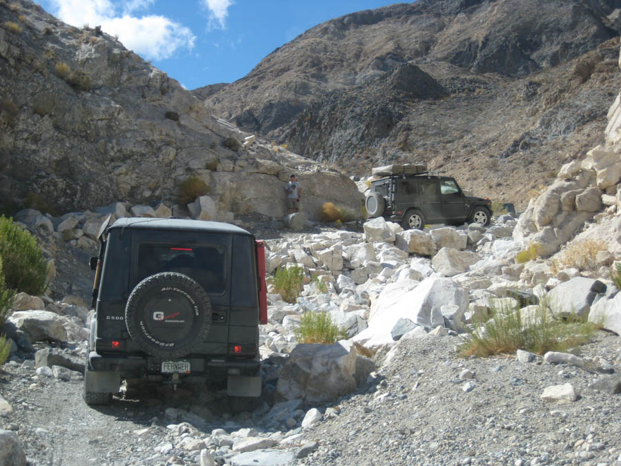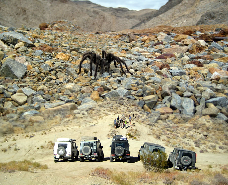 | Inkblotz Expert Date registered: Apr 2006 Location: Georgia Vehicle(s): 90 300GD "Thundering Turtle II", w/ 603A turbo Posts: 3190 ![]() | RE: Looking for a few good souls for a Death Valley trip There was one scary moment in Death Valley which left our group in shock for the remainder of the day. Since Mike and I were bringing up the rear (as usual) we came across our group standing motionless as they faced the greatest impass a G group has ever faced. There in front of them stood a hybrid tarantula. Luckily Steve knew that a spider's vision was poor and that motion was the only thing that attracted them. They froze in their tracks. Mike and I watched helplessly in horror from the neighboring hillside as the hairy beast strolled past picking up on the motion of a passing goat. After several minutes (which seemed like hours) the group made their way back to their G's and continued on with renewed caution. Mark Edited by Inkblotz 11/4/2009 5:07 PM (CloseCall.jpg) Attachments ---------------- CloseCall.jpg (202KB - 174 downloads) | ||