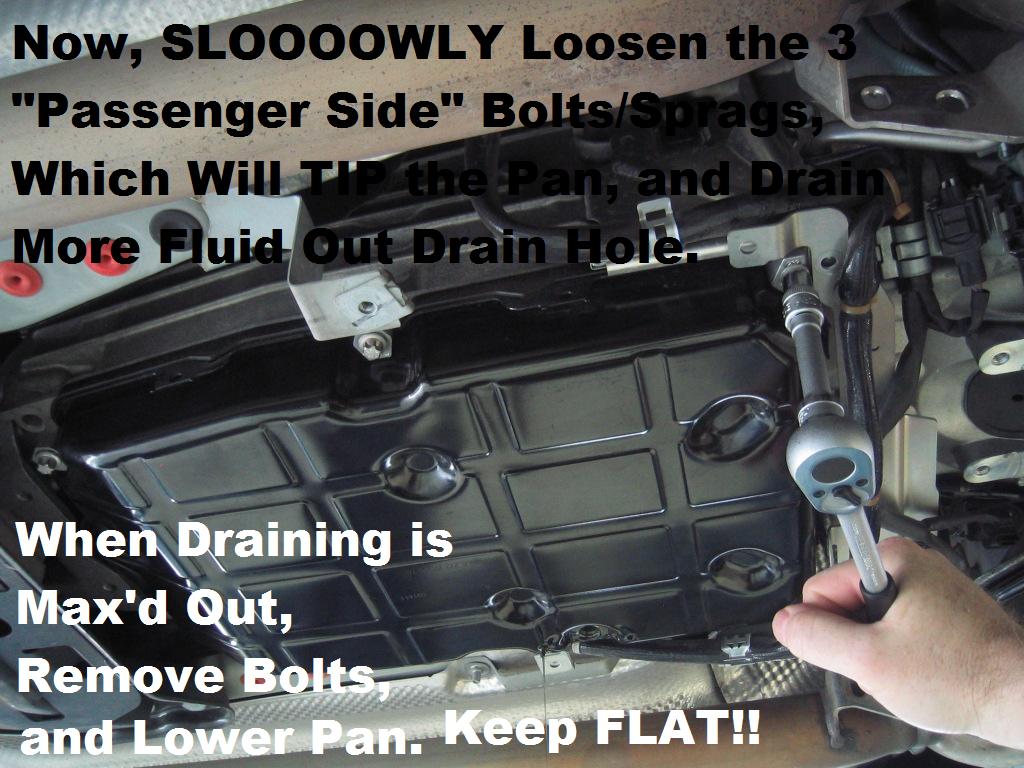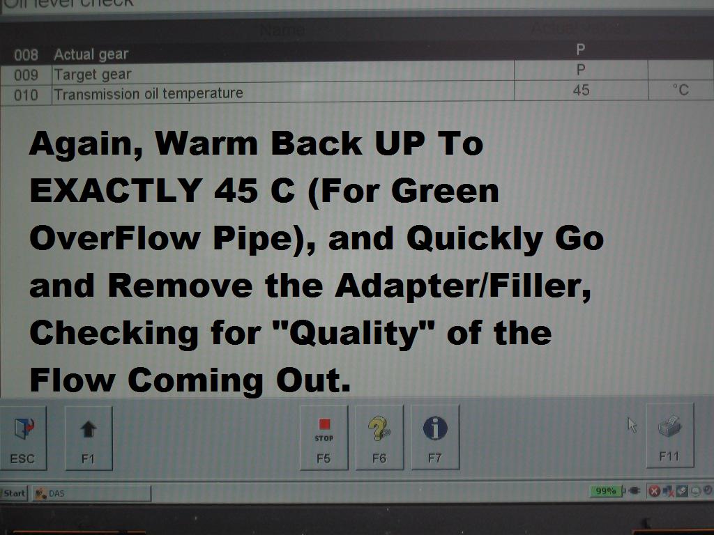 | G-AMG G-Class DIY Host Date registered: May 2006 Location: South Texas Vehicle(s): '04 G55, '80 280GE, '99 S420, '98 E320, 2011 E350 ![]() | Photo DIY- 722.905 "7G Tronic" NAG 2+ Transmission Oil/Filter Change Yes, I realize this is aimed at a very NARROW group on this site... but I believe the Newer G's have the 7G Tronic Transmissions. I have yet to see an actual "Pictorial" on this Newest Version of the 722.9, so I'll throw it out there for you.. As a very Clear Preface... this job is not for the average DIY'er. It requires a "Significant" number of Tools, including the STAR Computer, which is AN ABSOLUTE **MUST** IN ORDER TO CORRECTLY ADJUST THE FLUID LEVEL!!! Also, I will be *CLEAR*, there are MULTIPLE VARIATIONS of these Transmissions, you MUST VERY VERY CAREFULLY Research you exact Transmission, to ascertain WHICH procedure to use, and which Transmission FLUID to use... the Latest uses the New 236.15 Spec Fluid which is BLUE!!!!! This Fluid is ***NOT*** Back-Compatible!!! This Post is for a 722.905 NAG2+ Box in a 2011 E350 (212.056), which was Built AFTER the Latest/Greatest Update which was on June 21, 2010, so all vehicles after this date "Should" have the Green Overflow Pipe, and Beveled Pan. Again, *YOU MUST BE 100% POSITIVE* about your Transmission prior to starting the job. ANOTHER *HUGE* CAVEAT!!- *DO NOT ATTEMPT THE "I'LL TAKE A LASER TEMPERATURE MEASUREMENT OF THE PAN" TRICK TO GET THE OIL TEMPERATURE!!!" I have a nice, High-End Fluke Laser Thermometer, and what I was measuring at the Pan, and what STAR was Reporting??? It was OFF by a much as 10 C!!!! ***YOU MUST BE EXACTLY ON TARGET TEMP TO DO THIS JOB!!!***, and the Car must be **LEVEL**, so you will have to have it on 4 equal Ramps/Jack-Stands. As you know, there is NO Dipstick to check the Fluid Level, and you "Pump" the Oil *UP* via the Drain-Hole. Instead, one needs to bring the oil Temp to a PRECISE temperature, and "Visually" evaluate the Flow of Oil out the Stand Pipe. What an IDIOTIC way to do an automotive job!!! My "moderate flow" or "Drip pattern" may be waaaay different than the next guy's interpretation. It's quite a "Joke" in my mind... BUT!! You must change the fluid in these boxes... so you're STUCK!! Over-Maintaining me... I'm doing the Service at 30,000 Miles, instead of the Recommended 39,000 Mile interval. In summary, I Intended this post to be "ENTERTAINMENT VALUE ONLY!!!!!!!" If you Don't have the Proper Set-Up, DON'T DO THE JOB!! G (0.JPG) (1.jpg) (2.jpg) (3.jpg) (4.jpg) (5.jpg) (6.jpg) (7.jpg) (8.jpg) (9.jpg) (10.jpg) (11.jpg) (12.jpg) (13.jpg) (14.jpg) (15.jpg) (16.jpg) (17.jpg) (18.jpg) (19.jpg) (20.jpg) (21.jpg) (22.jpg) (23.jpg) (24.jpg) (25.jpg) (26.jpg) (27.jpg) (28.jpg) (29.jpg) (30.jpg) (31.jpg) (32.jpg) (33.jpg) (34.jpg) (35.jpg) (36.jpg) (37.jpg) (38.jpg) (39.jpg) (40.jpg) (41.jpg) (42.jpg) (43.jpg) (44.jpg) (45.jpg) (46.jpg) (47.jpg) (48.jpg) (49.jpg) (50.jpg) (51.jpg) Attachments ---------------- 0.JPG (46KB - 187 downloads) 1.jpg (83KB - 166 downloads) 2.jpg (119KB - 185 downloads) 3.jpg (82KB - 184 downloads) 4.jpg (99KB - 180 downloads) 5.jpg (94KB - 191 downloads) 6.jpg (129KB - 171 downloads) 7.jpg (139KB - 176 downloads) 8.jpg (100KB - 174 downloads) 9.jpg (72KB - 178 downloads) 10.jpg (120KB - 177 downloads) 11.jpg (93KB - 181 downloads) 12.jpg (79KB - 175 downloads) 13.jpg (86KB - 200 downloads) 14.jpg (78KB - 177 downloads) 15.jpg (98KB - 189 downloads) 16.jpg (81KB - 199 downloads) 17.jpg (106KB - 170 downloads) 18.jpg (118KB - 168 downloads) 19.jpg (102KB - 164 downloads) 20.jpg (115KB - 189 downloads) 21.jpg (115KB - 175 downloads) 22.jpg (105KB - 186 downloads) 23.jpg (97KB - 184 downloads) 24.jpg (122KB - 174 downloads) 25.jpg (135KB - 170 downloads) 26.jpg (137KB - 174 downloads) 27.jpg (117KB - 164 downloads) 28.jpg (117KB - 173 downloads) 29.jpg (126KB - 173 downloads) 30.jpg (126KB - 156 downloads) 31.jpg (101KB - 160 downloads) 32.jpg (88KB - 180 downloads) 33.jpg (92KB - 164 downloads) 34.jpg (83KB - 164 downloads) 35.jpg (107KB - 176 downloads) 36.jpg (102KB - 179 downloads) 37.jpg (120KB - 163 downloads) 38.jpg (82KB - 173 downloads) 39.jpg (94KB - 165 downloads) 40.jpg (56KB - 170 downloads) 41.jpg (105KB - 164 downloads) 42.jpg (112KB - 174 downloads) 43.jpg (99KB - 171 downloads) 44.jpg (81KB - 175 downloads) 45.jpg (111KB - 170 downloads) 46.jpg (118KB - 165 downloads) 47.jpg (84KB - 176 downloads) 48.jpg (94KB - 177 downloads) 49.jpg (106KB - 153 downloads) 50.jpg (116KB - 176 downloads) 51.jpg (120KB - 155 downloads) | ||