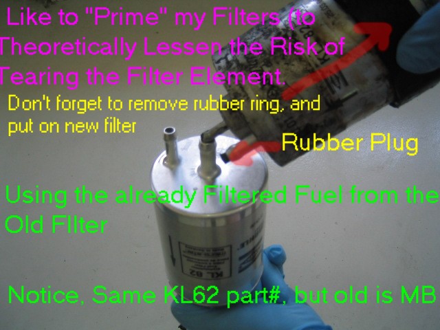 In the pic showing the filter "priming", I am placing the EXIT fitting of the OLD filter against the ENTRANCE fitting of the NEW filter. You can see the size discrepency.