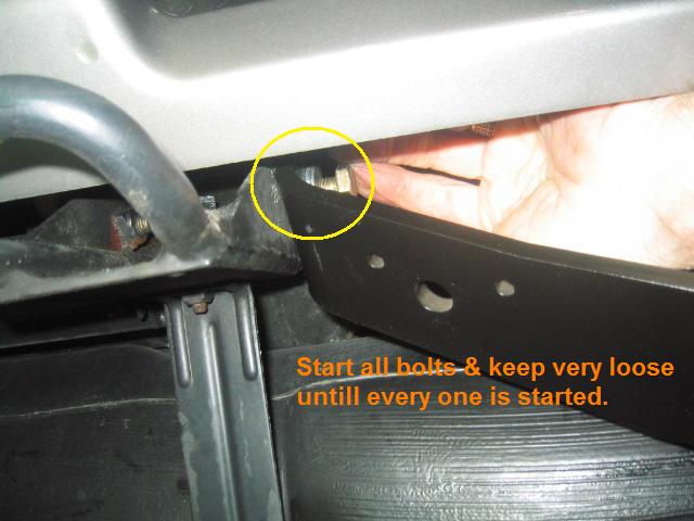 You will want to install all the bolts loose. The side tie bars were the hardest bolts to start. My threaded holes were rusty & needed to be cleaned out with a tap. Once all the bolts are started tighten the side tie bar bolts and then the 4 center bolts.