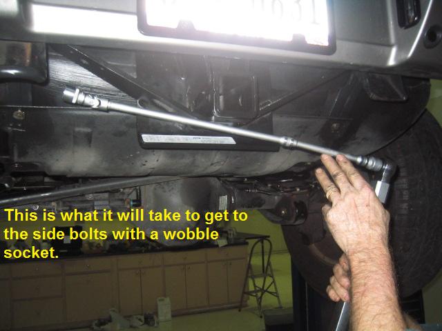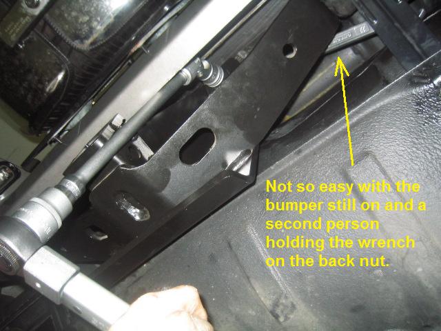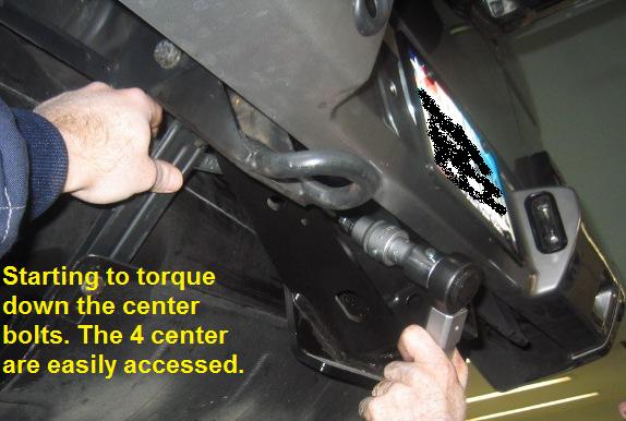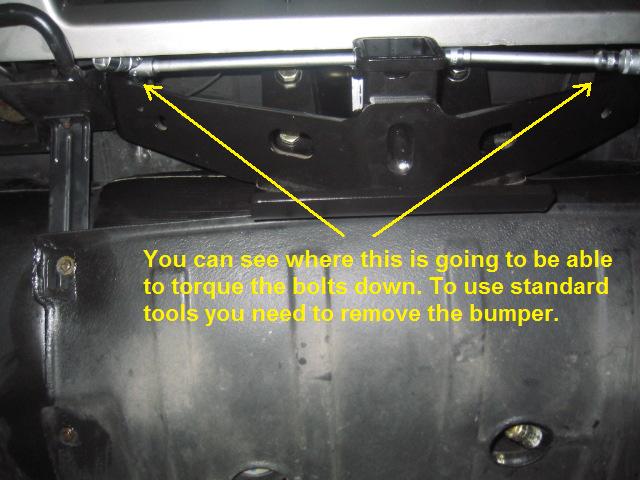 In retrospect, if you do not have the specialized tools available (wobble sockets, socket universal joints & extensions), you would be well advised to go ahead and remove the bumper. It gets very hard to correctly torque down the bolts with the bumper in place.