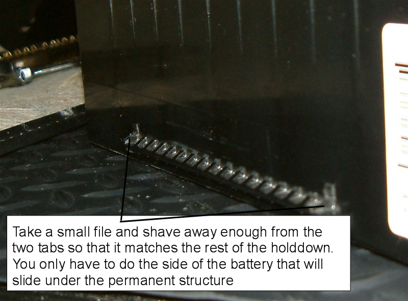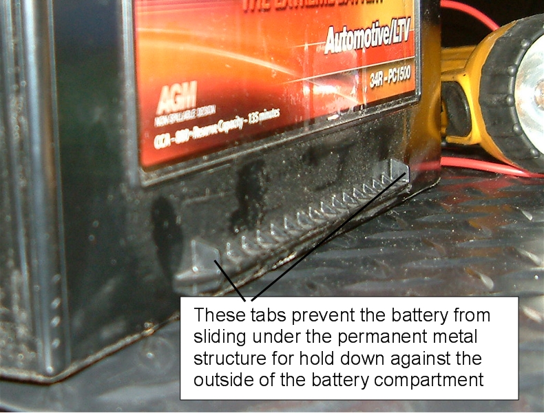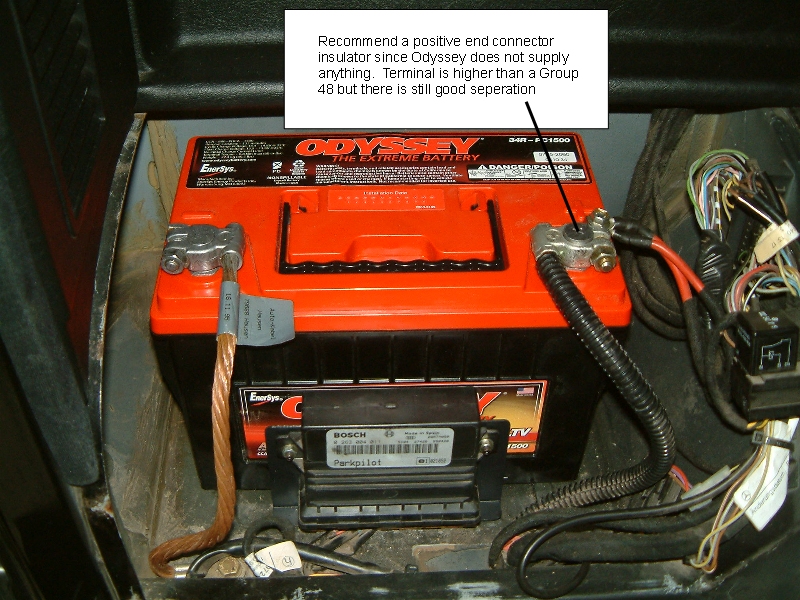 | J.R. Elite Veteran Date registered: Apr 2006 Location: Southern Maryland Vehicle(s): 00 G500, 09 911 4S, 11 Cayenne S, 86 280GE (sold) Posts: 829 ![]() | Odyssey 34R PC1500 install. Modification required for safe fitment Changing out a battery in the pre-MBUSA 463 (battery compartment in the back left of the vehicle) should be straight forward, but there is an issue: - Remove all jewelery to include neck chains - Disconnect negative lead first - Disconnect positive lead next - Remove small electronics box - Remove hold down - Remove old battery (place a rag on top of the positive terminal to prevent an accidental short) - Clean terminals. Remove all coatings, petroleum jelly and wire brush the contact surface - ***Modify battery's hold down structure on side opposite the battery terminals *** - Install battery - Install hold down - Install small electronics box - Connect positive terminal - Connect negative terminal ***The Odyssey case design causes a hold down problem which can be a safety issue. You need to do a small simple modification, otherwise the battery can move upwards on the opposite side of the removable hold down. If the battery breaks free (accident, off road driving, etc), and both terminals make contact with the compartment cover, then things can go badly quickly. Here are the pictures. (Odyssey1.jpg) (Odyssey2.jpg) (Odyssey3.jpg) (Odyssey4.jpg) Attachments ---------------- Odyssey1.jpg (415KB - 200 downloads) Odyssey2.jpg (342KB - 198 downloads) Odyssey3.jpg (274KB - 188 downloads) Odyssey4.jpg (398KB - 194 downloads) | ||