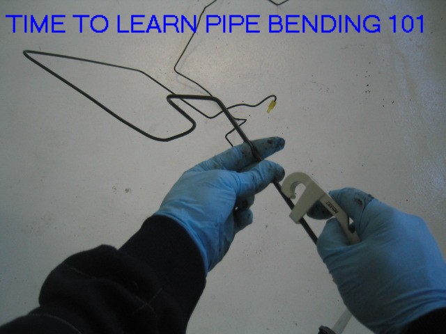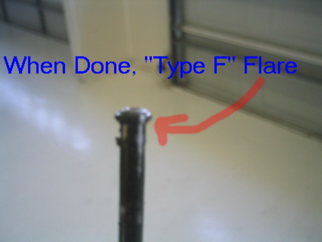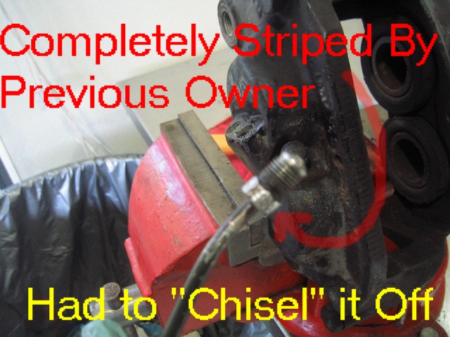 The other project/SNAFU was trying to remove the Caliper Pipe to Caliper "Nut". The previous monkey completely stripped the nut, which required complete destruction to remove it. So I had to repair that. I used one of the fittings off of the bent pipes mentioned above. One big note on this repair...... DON'T FORGET TO PUT THE NUT ONTO THE PIPE "BEFORE" YOU FLARE THE END..... HA HA! (I'm laughing at myself.... ALMOST did it Hee Heee) By the way, the G uses a "Type F" flare.
