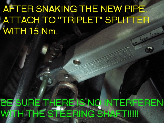 The other hellish chore was prising the metal/rubber fixating "clamp" which sits on top of the left longitudinal frame, and just medial to the steering shaft. It took nearly a half a day to both open, and close that bugger. There is zero room. This clamp was critical, because this section of the pipe runs underneath the steering shaft, and must be kept safely clear of the steering system, for obvious reasons.