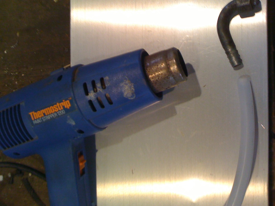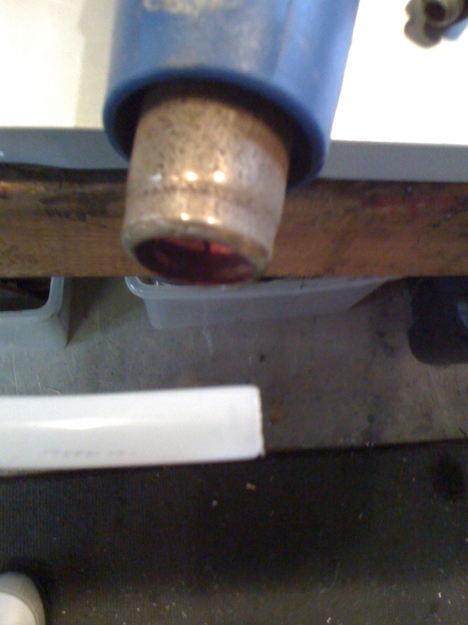 Once you have all the sections made it's time to attach the new pipe. Take the fittings, line them up and using your Photo/memory proceed to the next step. Take your heat gun turn it on, lay it on a table aimed toward you, hold the end of the plastic pipe to be attached and rotate it in front of the heat gun keeping it about 2-3 inches away. It will not take long to heat it up. Now holding the warmed pipe in one hand and the fitting in the other push the fitting into the softened pipe. If it does not go on all the way heat it some more by rotating it until it goes completely onto the fitting. Them proceed to the rest of the fittings.