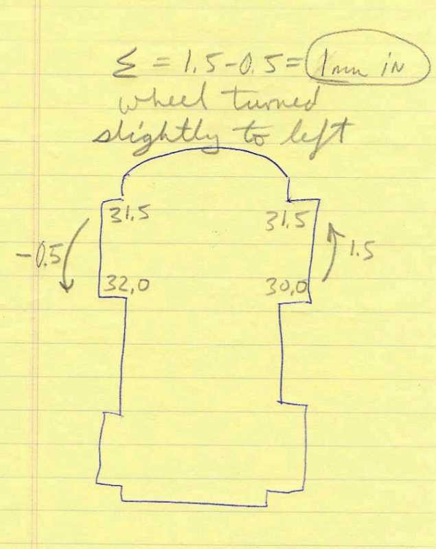 Allister779 - 9/10/2010 9:30 PM I love this explanation! Thank you. Can you just clarify something for me on step 5 about the interpretation: Your drawing shows that you are 1.0 mm "in", but your instructions say to half that number for your final toe-in to give you a toe-in of 0.5mm. Is that because you are splitting the final measurement between the two wheels?