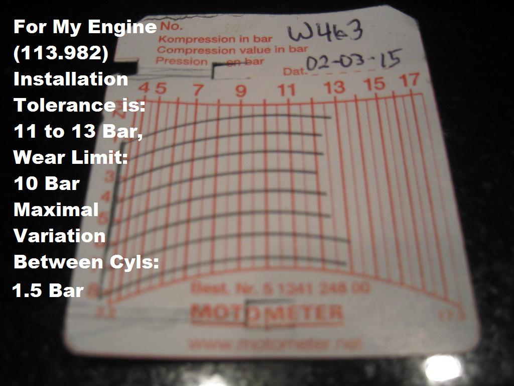 | G-AMG G-Class DIY Host Date registered: May 2006 Location: South Texas Vehicle(s): '04 G55, '80 280GE, '99 S420, '98 E320, 2011 E350 ![]() | Re: Photo DIY- Engine Compression Testing M113 WEBIII - 2/6/2015 11:29 AM Assuming the #4 cylinder's rate of degradation continues to outpace the #7, do you have any concern about the deviation between 4 and 7? Is the #4 cylinder the farthest from the oil pump on an m113? Thanks for the effort to make all these writeups. Supposedly, up to 1.5 Bar Variation is "Normal". To be honest, that #4 was a bit harder to press-in the Rubber cone. I probably should ha used the Screw-In method. | ||