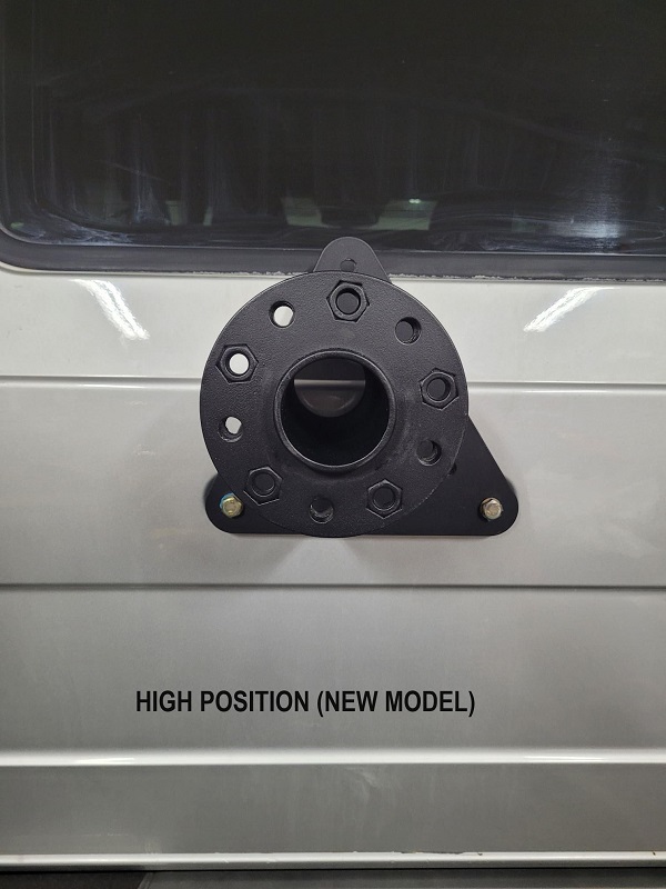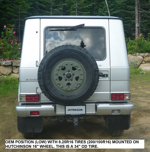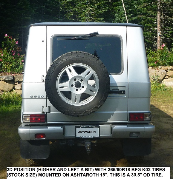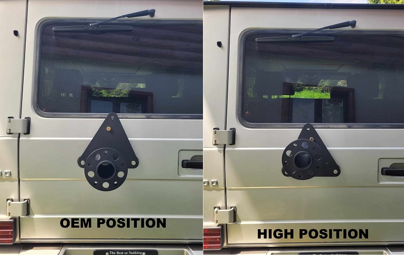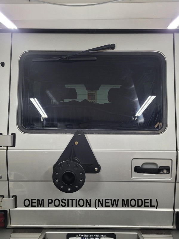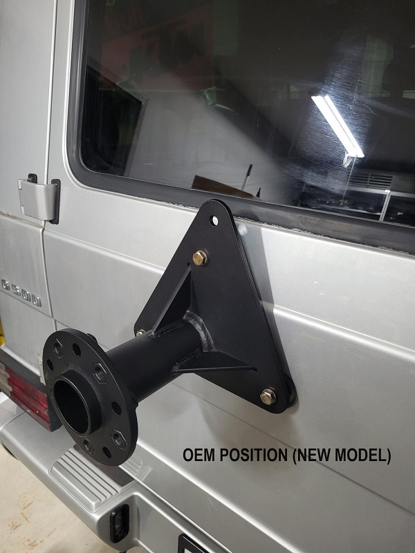 To recap, here's more details: It also allows larger tires to clear rear door with included 'high offset' hardware kit. There is 2 sets of hardware to assemble the mount to your G (one for OEM tires and the other for wider tires) + a set of 5 black wheel lug bolts to hold your spare wheel on the mount. An all-inclusive solution of the upmost quality and finish. Fully welded, heavy, thick steel, powder coated in a 2 step process. Clear and easy install instructions with pics.