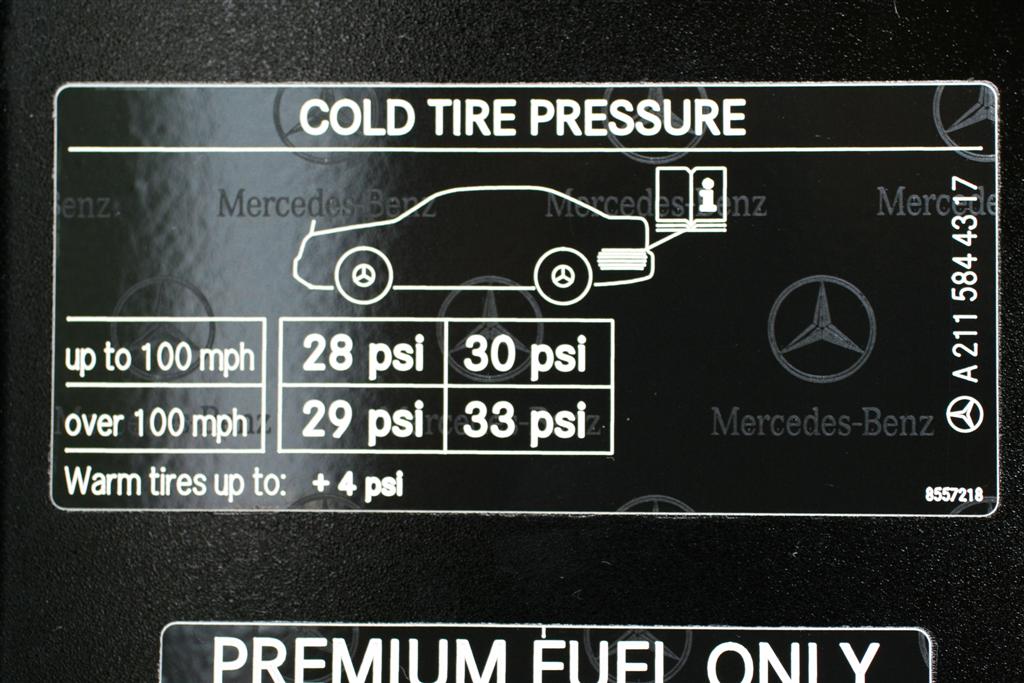 Here is a macro picture of what looks like on my E320.As you can see there are two recommended PSI's one for up to 100 mph and one for over 100 mph .