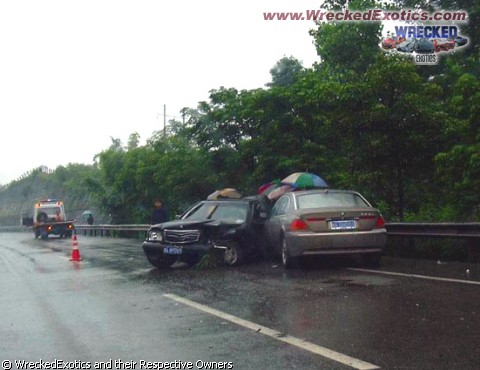 Considering the front end damage on the 140 it looks like the car has spun perhaps being hit by another car? Anyway all the people from both cars would walk away from that I am sure.
