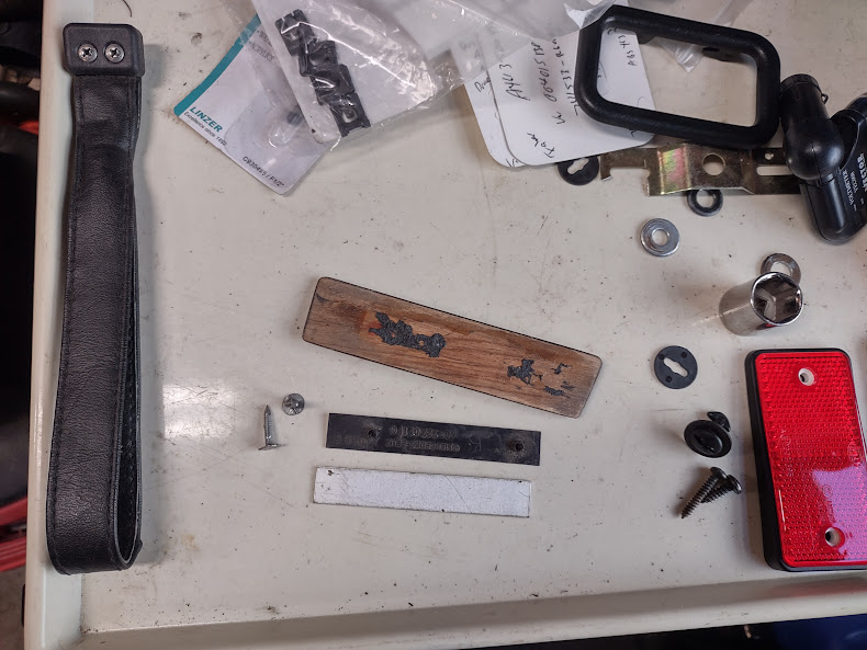 The small wood trim piece on the 1990-2000 463 covers the mounting screw for the forward door handle attachment. On the back side of the wood trim is a plastic strip that has 2 integral plastic studs. These plastic studs commonly fail and the user ends up adding double stick tape, velcro, or some other method of attachment.