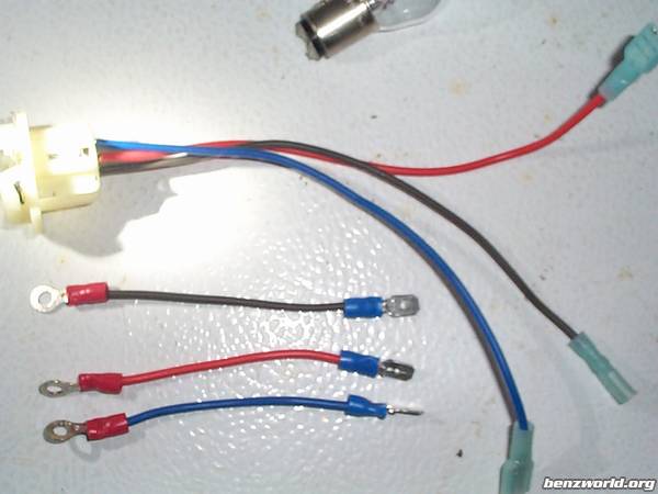 The first version just had spade terminals at the end of the pigtails, and I drilled small holes in the conductive plate and screwed the terminals to the plate with small tapping screws ( #6 x 1/2" ). This next version has spade connectors so I can pull the holder out of the car without tools. The pigtails are long enough to change bulbs, though if you want to keep the work simpler.