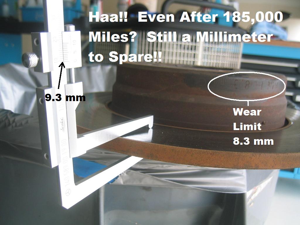| G-AMG G-Class DIY Host Date registered: May 2006 Location: South Texas Vehicle(s): '04 G55, '80 280GE, '99 S420, '98 E320, 2011 E350 ![]() | Photo DIY- Rear Rotor & Pad Installation Well.... after 19 Years, and 185,000 Miles.... the ORIGINAL Rear Rotor STILL has 1 mm of meat still left on it! I opted to go with MB Branded Brake Parts. I have seen, first-hand, that there *IS* a Difference between the M-B branded Rotors, and the OEM Supplier version of the SAME EXACT Rotor. One of my G-Wagen friends down here bought the same ATE part number as the M-B Rotor. It really did not "Look/Feel" right... so he order the M-B version. We had the two side-by-side, and there DEFINATELY was a difference in the Milling, and overall "Heft". Soooo, since I Always Preach: "There is only *ONE* system on a vechile which matters.... and that is the *BRAKES* !!! You can survive with a failure of just about every other system..." I decided to go First-Class and get another 19 yrs/185K with M_B parts. Anyhooo, here is the procedure for a 1998 E320 W210.065. Some models differ, so PLEASE check your Repair Manual for your particular version. This especially applies to the Rear Fixed Caliper Mounting bolts which come in TWO sizes, M10 (in my case) which is a 55 Nm Torque, and a M12 version (115 Nm, like the Fronts). Also, *PLEASE* use great care Lifting/Securing Vehicle. DIY Wrenching is NOT worth risking your life over!! A few Changes since my other posts regarding brake/hub work: The Anti-Seize paste has changed from the "M-B Long Term Grease (aka Castrol OlistaMoly II) to the Newer version of "Hot Paste" (Castrol Optimal Paste TA), which I think is the same stuff you see on O2 sensor threads. I REALLY like this stuff better than the older style grease in that it is MUCH 'stickier' and does NOT melt/ooze/run like the Olistamoly, so less risk of getting into the Lug Bolt Threads. I know alot of folks don't like to Press-Back the caliper pistons due to risk of driving "Crud" back up into the ABS components, etc. Well, all I know is THIS is the way M-B WIS recommends it. Plus? Since I bleed my brakes on an ANNUAL basis? I personally don't worry about any "Crud" in there!! Please also note, I do a FULL Brake Bleeding after Brakework, anyway. And, as with ***ALL*** Brake Repairs, make sure you THOROUGHLY Pump the Brakes, and do THOROUGH Start/Stop Testing PRIOR to Venturing Out onto the Roadways!!!! "G" Edited by G-AMG 5/21/2016 10:46 AM (1.jpg) (2.jpg) (3.jpg) (4.jpg) (5.jpg) (6.jpg) (7.jpg) (8.jpg) (9.jpg) (10.jpg) (11.jpg) (12.jpg) (13.jpg) (14.jpg) (15.jpg) (16.jpg) (17.jpg) (18.jpg) (19.jpg) (20.jpg) (21.jpg) (22.jpg) (23.jpg) (24.jpg) (25.jpg) (26.jpg) Attachments ---------------- 1.jpg (75KB - 228 downloads) 2.jpg (99KB - 224 downloads) 3.jpg (82KB - 226 downloads) 4.jpg (107KB - 225 downloads) 5.jpg (96KB - 219 downloads) 6.jpg (85KB - 223 downloads) 7.jpg (101KB - 230 downloads) 8.jpg (93KB - 228 downloads) 9.jpg (113KB - 231 downloads) 10.jpg (111KB - 231 downloads) 11.jpg (94KB - 231 downloads) 12.jpg (70KB - 225 downloads) 13.jpg (112KB - 218 downloads) 14.jpg (65KB - 222 downloads) 15.jpg (85KB - 225 downloads) 16.jpg (83KB - 246 downloads) 17.jpg (85KB - 227 downloads) 18.jpg (101KB - 237 downloads) 19.jpg (94KB - 223 downloads) 20.jpg (77KB - 232 downloads) 21.jpg (70KB - 238 downloads) 22.jpg (66KB - 226 downloads) 23.jpg (80KB - 243 downloads) 24.jpg (115KB - 227 downloads) 25.jpg (75KB - 235 downloads) 26.jpg (80KB - 239 downloads) | ||