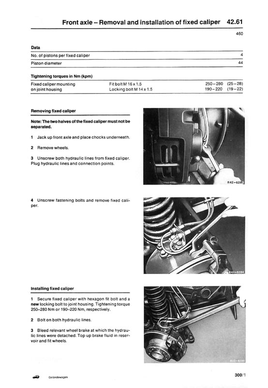 | DUTCH Administrator Doppelgänger Date registered: Apr 2006 Location: US, GA, Atlanta Vehicle(s): 2015 Audi Q7 3.0 TDI,2018 Sprinter Posts: 9965 ![]() | Torque Values - 02/2008 WIS Bolt: Fixed Caliper to Steering Knuckle: 265 Nm for 460, 461 & 463 Bolt: Fixed Caliper to Joint Housing, M14: 220 Nm - 463 only. Bolt: Fixed Caliper to Joint Housing, M16: 280 Nm - 463 only. "Replace Bolts" in all cases. | ||