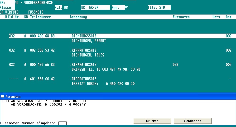 | G-AMG G-Class DIY Host Date registered: May 2006 Location: South Texas Vehicle(s): '04 G55, '80 280GE, '99 S420, '98 E320, 2011 E350 ![]() | RE: Photo DIY- Front Caliper Rebuild- W460 Perrot Bram, Sorry, now I understand what you mean, you are looking for the WHOLE set, not just the Rubbers.. Well, here is the EPC for my VIN. If you give me yours, I'll run your number. But, I am wondering if your Axle number may be BEFORE the footnoted axle numbers. Thus, the A 000 420 66 83 part number DOES NOT APPLY TO YOUR TRUCK. (Caliper.JPG) Attachments ---------------- Caliper.JPG (97KB - 223 downloads) | ||
