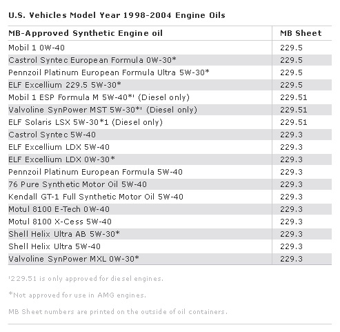 | lkchris Veteran Date registered: Nov 2006 Location: Albuquerque Vehicle(s): '07 GL320CDI, '06 E320CDI Posts: 144 ![]() | RE: Up to date Mercedes Benz Lubrication Specs Don't be confused by "diesel only" with respect to the 229.51 oils. What's "only" about it is that they're the only oils approved for the diesels. They can certainly be used in the gas cars, and many dealers will only have this one oil anyway. It's really irrelevant to include them on the 1999-2004 chart, as there aren't any diesels in this timeframe anyway, save for Sprinter Vans. In addition, 2005-2006 E320CDI are fine with 229.5 oil. BTW, with respect to the diesels requiring 229.51 oil, they feature a sticker under the hood cautioning not to add ANY quantity of noncomplying oil. Risk is poisoning the diesel particulate filter. Edited by lkchris 3/30/2008 6:38 PM | ||