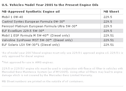 | gbenzer Extreme Veteran Date registered: Dec 2006 Location: Georgia Vehicle(s): 2007 G-500, 2017 Audi Q7 Posts: 418 ![]() | RE: Up to date Mercedes Benz Lubrication Specs What is in (or not in) oil spec 229.5 & 229.51 that is specified for the MY 2007 and later ( I think)? My manual says other oils will damage the engine. I understand to use the specified filters but why not another high end synthetic oil that is not 229.5 or 229.51? | ||