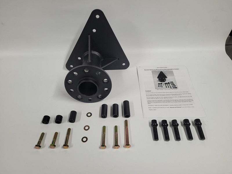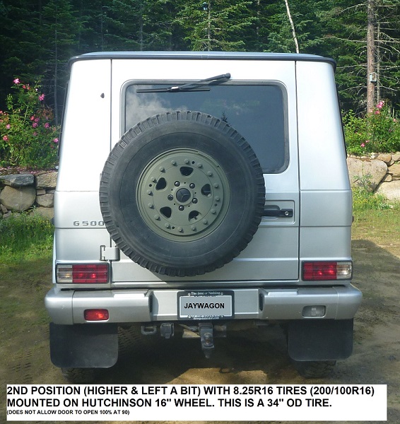 To recap, here's more details: It also allows larger tires to clear rear door with included 'high offset' hardware kit. There is 2 sets of hardware to assemble the mount to your G (one for OEM tires and the other for wider tires) + a set of 5 black wheel lug bolts to hold your spare wheel on the mount. An all-inclusive solution of the upmost quality and finish. Fully welded, heavy, thick steel, powder coated in a 2 step process. Clear and easy install instructions with pics.