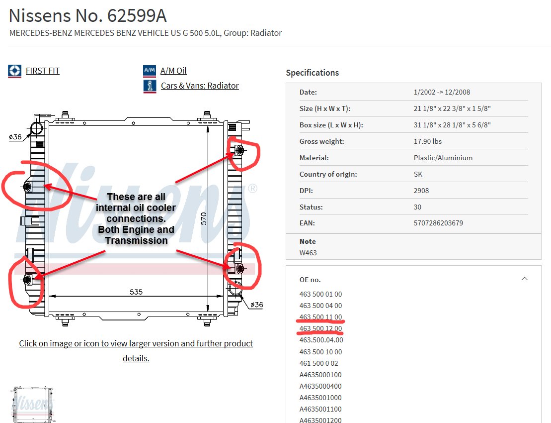 | gerryvz Extreme Veteran Date registered: Apr 2014 Location: Annapolis, MD Vehicle(s): 1994 G320, 1989 560SEC, 1994 E500 (W124) Posts: 336 ![]() | Re: Nissens Radiator on a G500 ? Hi Dutch, Yes, the EPC does specify that the correct part for my 463.231 (G320) is the 463 500 12 00 radiator. Sweet! It's good to know that there are non-factory alternatives of quality out there. Thanks for the info. Cheers, Gerry | ||