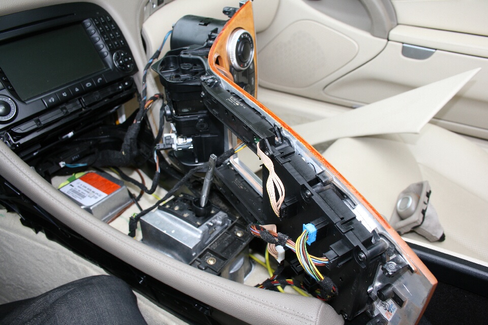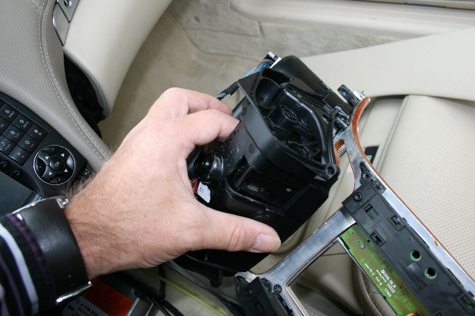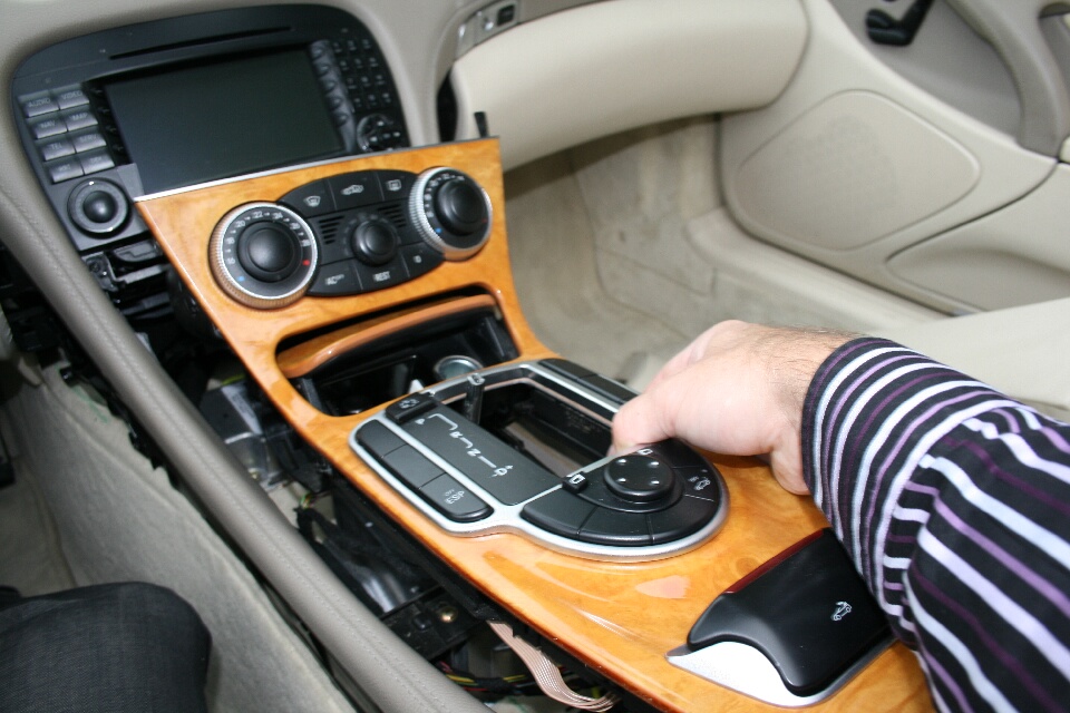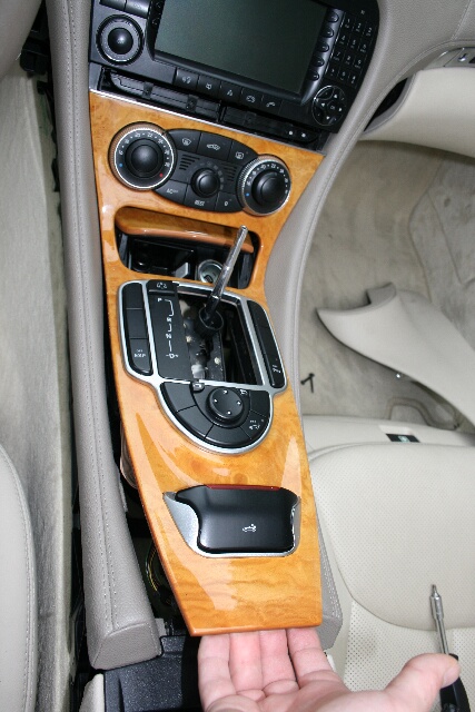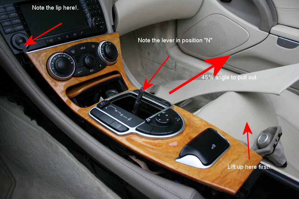 | pleubner Date registered: Apr 2006 Location: Basel, Switzerland Vehicle(s): ML270CDI Brabus-W163,SL55 AMG-R230,ML320 CDI-W164 ![]() | 7. Console Center removal Here comes the tricky part. The only way the panel will come out is at a 45% angle straight outward. There will be a little juggling around to find the right position. At this point you will also appreciate the position the gear selector lever is in. (which you should have set priot to removing the knob) Start at the rear end. Use both hands to ease the panel upward at the rear to about 45% angle then straight backward at this angle.