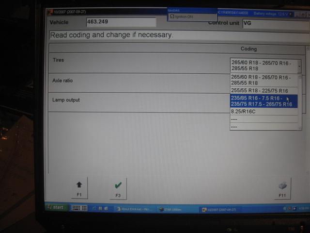 | fernweh Date registered: Apr 2006 Location: Calabasas, CA - Centenario, BCS - Luebeck, Germany Vehicle(s): Few Mercedes-Benz, a Toyota Amphibious and a Vespa ![]() | RE: 463 with larger tires - ESP problems solved I found it Tire size under 'special equipment' in the variant coding of the Instrument Control Unit. Let's see if that corrects the speedo problem of being 10% slow...... | ||