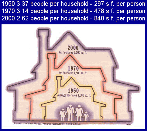 | 4x4abc Expert Date registered: Apr 2006 Location: La Paz, Baja California, Mexico Vehicle(s): 02 G500 Posts: 5917 ![]() | RE: G's and the environment... Well Joshua, you reminded me of a point that I wanted to make earlier - houses in the desert. Like in Arizona with a growth rate of cancer. Wind and solar will not satisfy the AC power demand theses houses have. And since nobody is building small houses any longer the demand of energy is truly ridiculous. I am tempted to compare that to your G55 argument - but I'll leave that alone. My point is - can we afford to constantly build more houses in the desert and why does everyone now need a 4000 sqft house? And I am not just talking. My Beverly Hills house had 2100 sqft. My new house in La Paz has 680. No TV, no living room (I'd rather be outside) no kitchen, do the cooking outside - just a comfortable bedroom, suitable office and cozy bathroom. (BuildingResourceUse1.gif) (HouseSquareFootChange.gif) Attachments ---------------- BuildingResourceUse1.gif (27KB - 82 downloads) HouseSquareFootChange.gif (36KB - 90 downloads) | ||